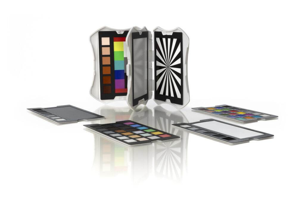 - 5 interchangeable, high-gloss video color target cards including a patent-pending Color Pattern Card, designed to leverage how video is processed for more precise, nuanced color accuracy. This card has 12 color patches in a unique configuration with a black, grey and white color patch in the middle, plus 6 skin tone tiles.