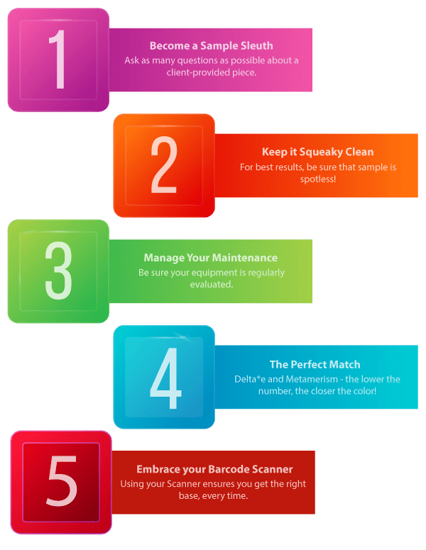Ci rendiamo conto che, anche con questi suggerimenti pratici, può capitare di sbagliare. In questo caso, il nostro consiglio principale è quello di mettere al lavoro il vostro computer per la corrispondenza dei colori. Se una correzione non è alla vostra portata, la migliore tecnologia di abbinamento di Datacolorfornirà una nuova formula aggiornata in grado di somministrare il colore di cui avete bisogno.