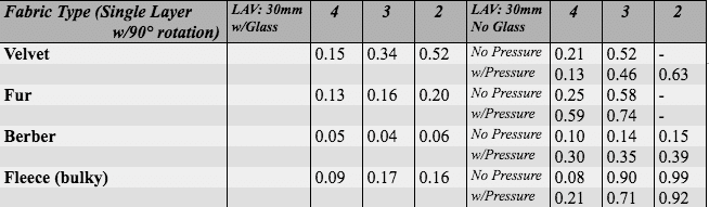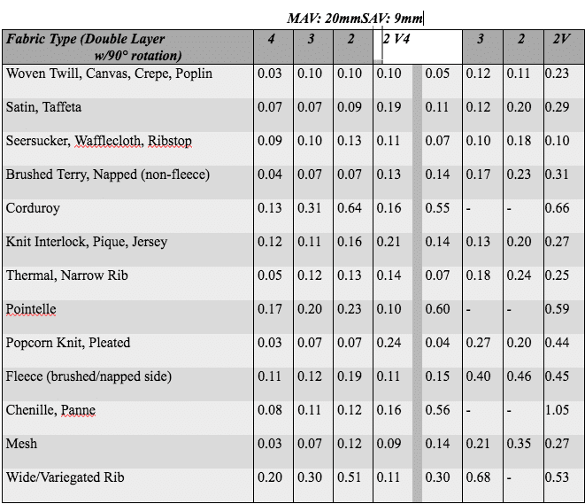 Le tabelle seguenti indicano la variabilità tipica delle misure per diversi tipi di tessuto. Il primo presenta i valori per i tessuti a maglia e a navetta utilizzando due comuni aperture dello strumento, mentre il secondo fornisce i risultati per i tessuti voluminosi/pile misurati con e senza vetro.