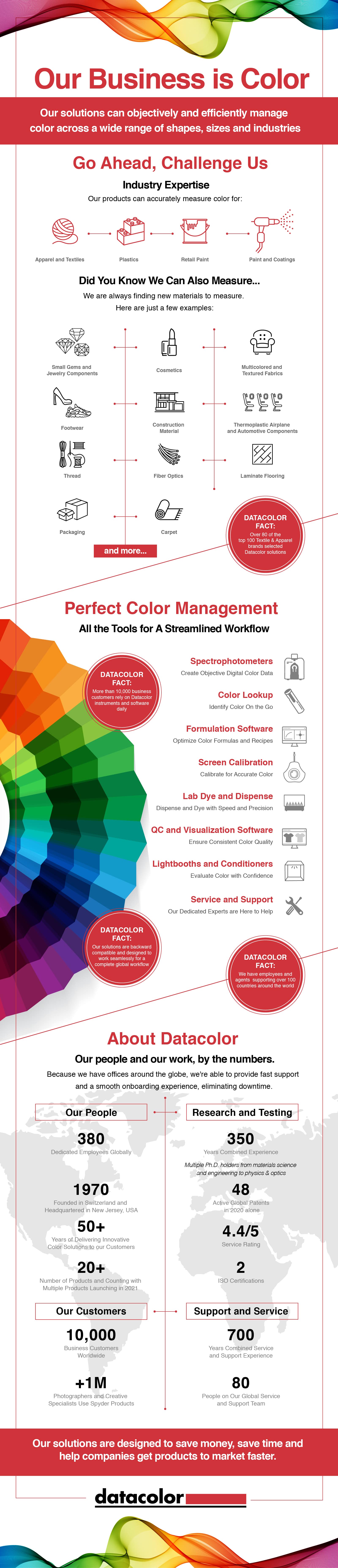 Noi di Datacolor siamo autori accademici e insegnanti della prossima generazione di esperti del colore, e abbiamo aiutato aziende di cui avete sicuramente sentito parlare a far decollare i loro programmi di colore digitale. Non siamo solo membri del team Datacolor, siamo estensioni del vostro team. Insieme aiutiamo i clienti a controllare il colore dal 1970. E prendiamo il colore molto seriamente, perché sappiamo che anche voi lo fate.